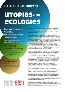Utopian scholars and creatives were invited to participate in a one-day workshop aimed at regional networking around the important but understudied relationship between utopia and ecology. The workshop hoped to strengthen the network of utopian scholars and creatives based in the German-speaking territories and neighbouring areas of Central and Northern Europe, loosely defined. The workshop offered a space for the collaborative exploration of utopias and ecologies in participants’ existing projects — including but not limited to ecology in utopian narratives, theory, and ethics as well as utopian thinking in environmentalism, sustainable development, or socio-ecological innovation.